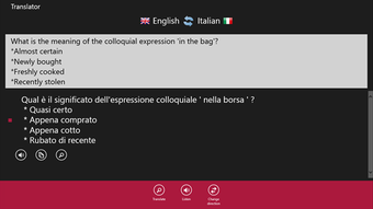 L'applicazione Italian-English (Inglese - Italiano) per smartphone e tablet è provvista di un ricco dizionario italiano – inglese disponibile anche in assenza di connessione internet, un comodo traduttore online, che ti consente di tradurre intere frasi di testo dall'inglese all'italiano e viceversa, ed una serie di simpatici quiz ed esercizi che ti aiutano ad imparare l'inglese.