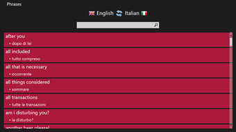 Inglese - Italiano è particolarmente adatto anche per imparare l'inglese meno formale, il vocabolario infatti include più di 2.200 frasi di uso comune che, con la semplice traduzione, sembrerebbero non avere alcun senso e che sono invece largamente utilizzate nel gergo di tutti i giorni.