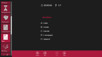 I test si dividono in due tipologie: test per la lingua scritta e test d'ascolto e comprensione. I test per la lingua scritta prevedono quiz in cui devi indovinare il significato della parola scritta in inglese, tra le cinque diverse proposte. Nel test d'ascolto, come intuibile, lo scopo è quello di comprendere quale parola viene pronunciata dal programma.