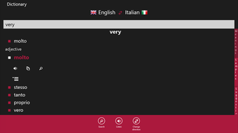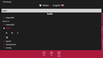 L'applicazione è semplice da utilizzare, nel menu posto a sinistra nella schermata principale sono presenti tutti i link per accedere alle sezioni. Per consultare il dizionario, seleziona il link relativo e nella parte centrale apparirà la casella di ricerca con le due opzioni: Inglese e Italiano. Inserendo una singola parola nel campo di ricerca all'interno del dizionario, otterrai non solo la sua traduzione, ma anche una serie di sinonimi, ordinati per rilevanza.